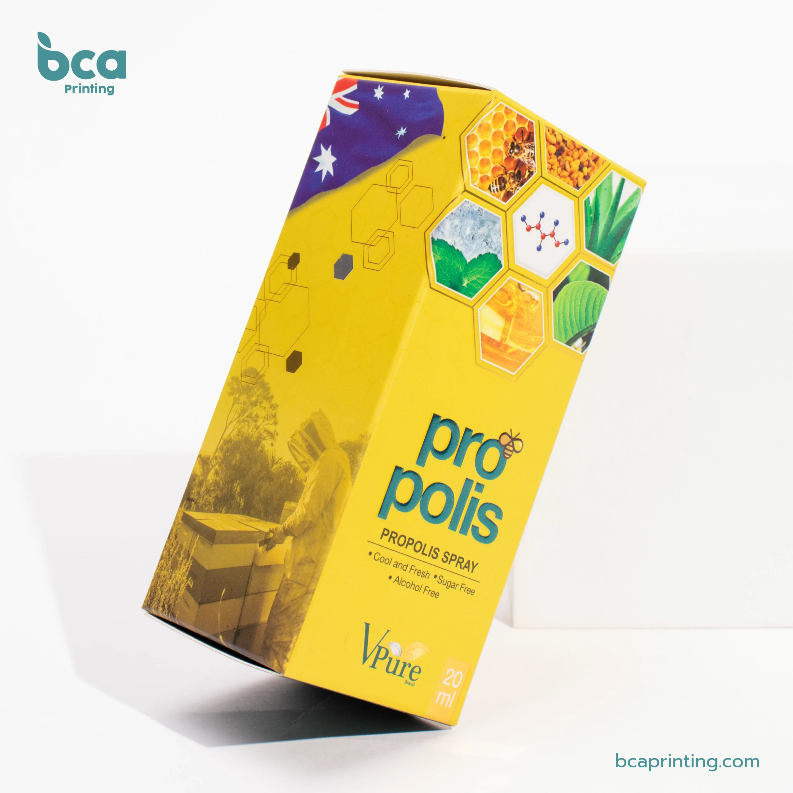 ทรงหกเหลี่ยม (Hexagon): การใช้รูปทรงรวงผึ้งมาเป็นกรอบใส่ภาพส่วนผสมต่างๆ (เช่น น้ำผึ้ง, ใบมิ้นต์, สมุนไพร) เป็นเทคนิคที่ชาญฉลาดมากในการสื่อถึง “Propolis” หรือสารสกัดจากผึ้ง