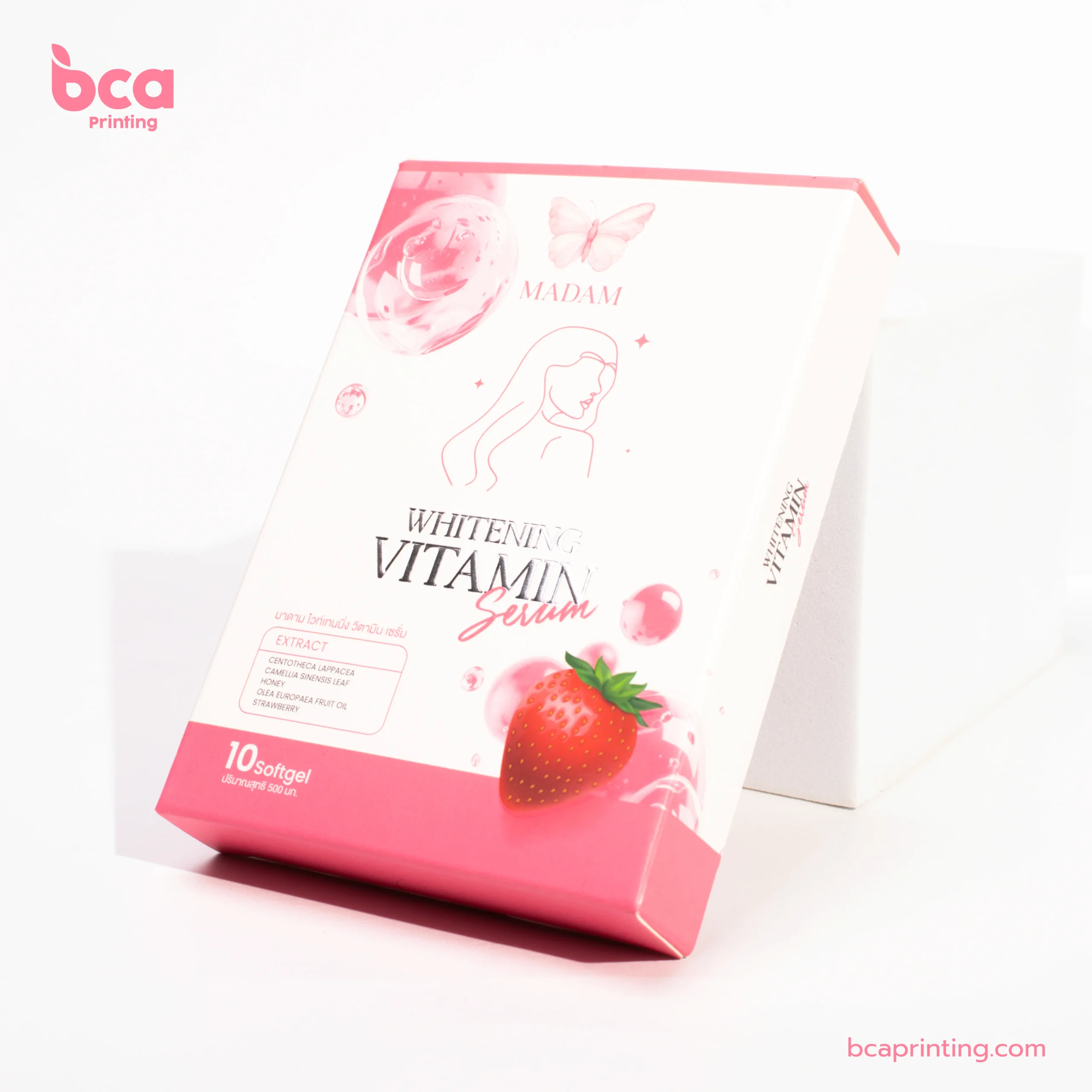 ปั๊มเคทอง/เงิน (Hot Stamping) [ทางเลือก]: ตรงคำว่า “MADAM” หรือ “VITAMIN” อาจจะมีการปั๊มฟอยล์สีเงิน หรือสีโรสโกลด์ร่วมด้วย เพื่อเพิ่มมูลค่าให้สินค้าดูแพงขึ้น (สังเกตจากการสะท้อนแสง)