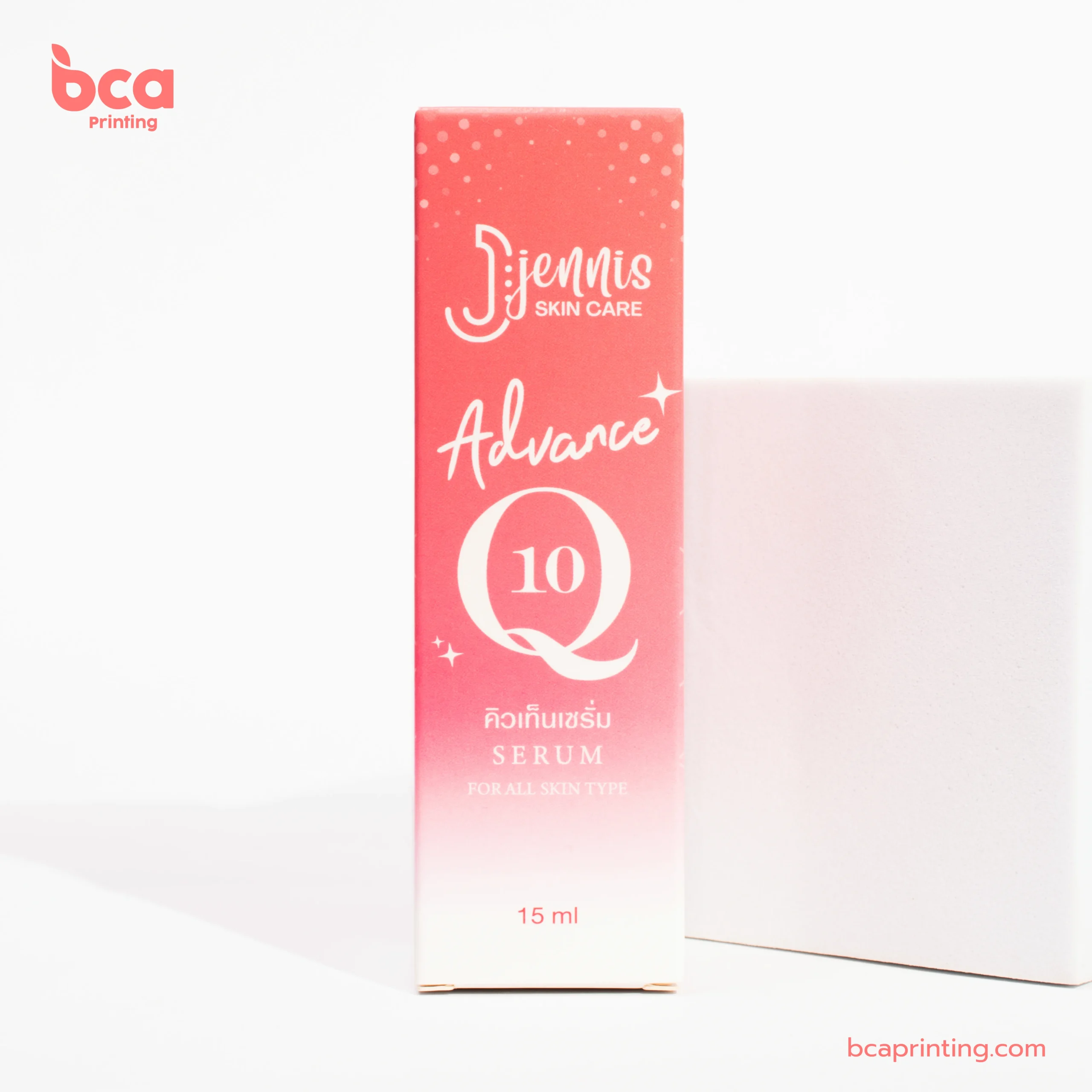 จากผลงานตัวอย่างที่เรานำเสนอ คือ กล่องเซรั่มขนาด 15 ml แบรนด์ Jennis Skin Care สูตร Advance Q10 ซึ่งเป็นเคสตัวอย่างที่แสดงให้เห็นถึงเทคนิคการผลิตและการออกแบบที่ลงตัว: